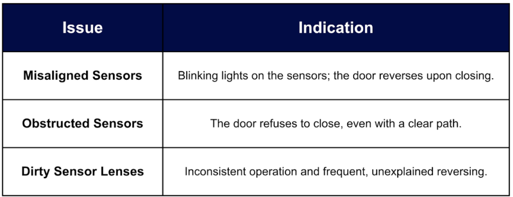 • Sensor misalignment: The door reverses unexpectedly due to dirty, broken, or poorly aligned safety sensors.